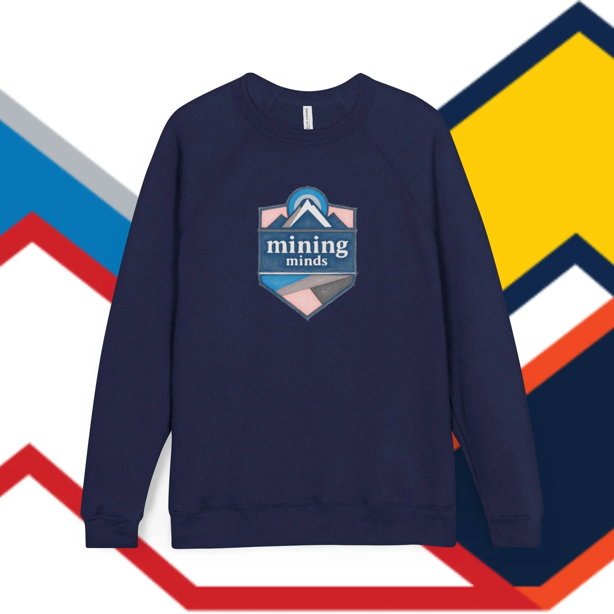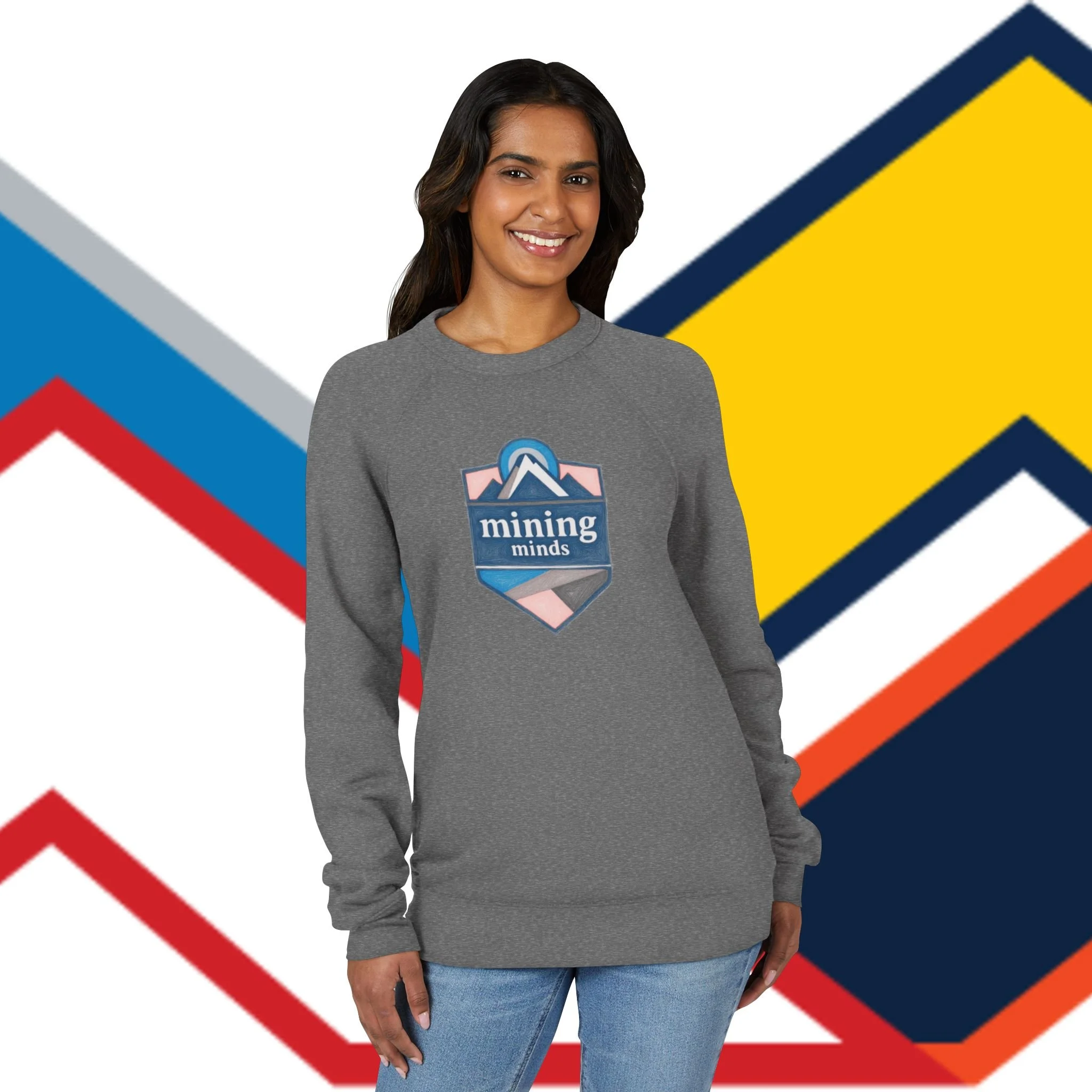 A medium-weight raglan crew sweatshirt designed for long days of thinking, exploring, and building. The front features a compact, crest-style emblem while the upper back carries a small, multicolored MINING MINDS mountain motif — subtle branding that reads like a quiet badge of belonging. Soft sponge fleece inside keeps your core warm without overheating. The relaxed raglan cut and 1x1 ribbed cuffs hold shape through repeated wear, and a tear-away tag keeps the neck comfortable. Wear it during coding sprints, study sessions, or low-key meetups to signal steady focus and shared curiosity.